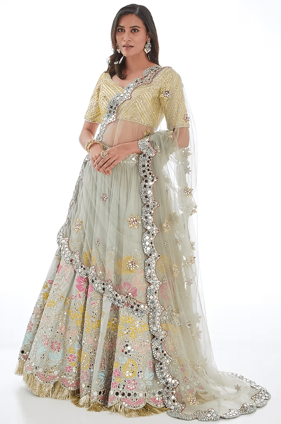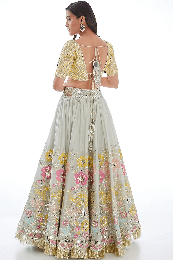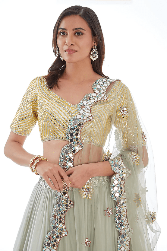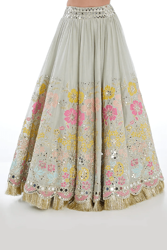 Featuring a powder blue lehenga in chanderi base with gota, applique, mirror and zari embroidery. It is paired with a net resham embellished blouse and a dupatta. Accentuate this designer lehenga with statement jewellery and heels for your wedding or engagement ceremony.