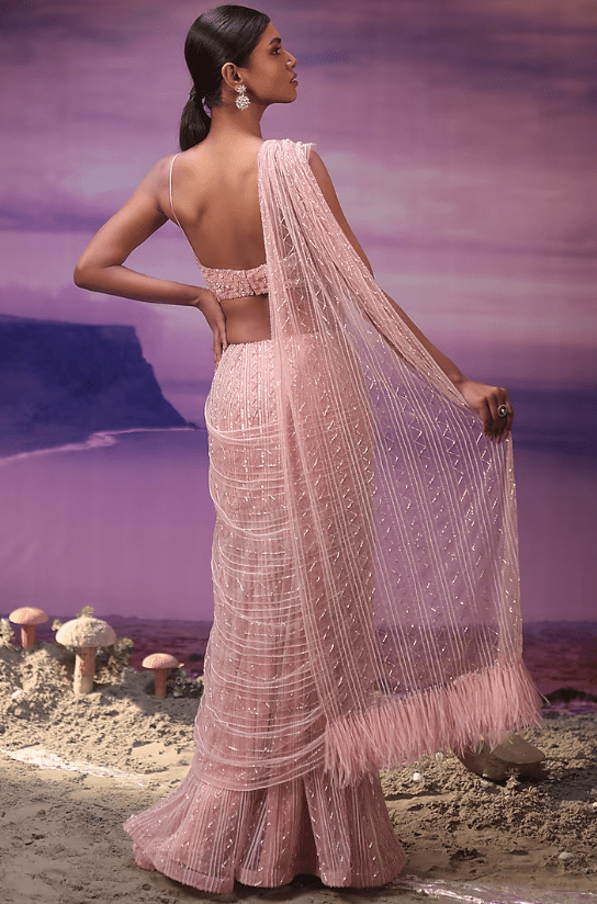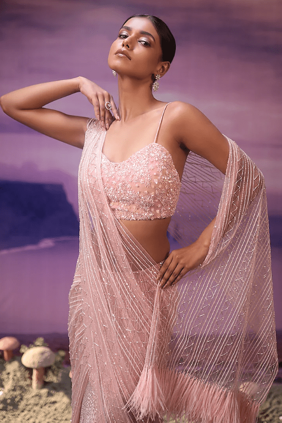 Featuring a powder pink saree in net and organza base with embroidery. It is paired with a blouse having floral boota detailing. Accentuate this designer set with statement jewellery and heels for an engagement, sangeet or cocktail party.