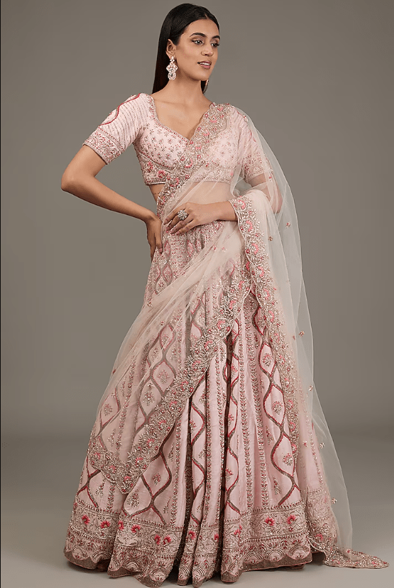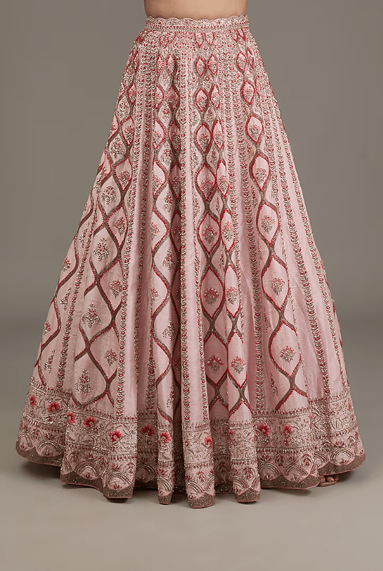 Featuring a powder pink lehenga in raw silk base with hand embellishments. it is paired with a blouse and a net dupatta. For weddings, a bride can style her bridal lehenga with statement jewelry and elegant heels to create a breathtaking, traditional look.