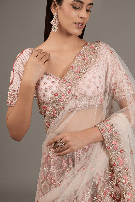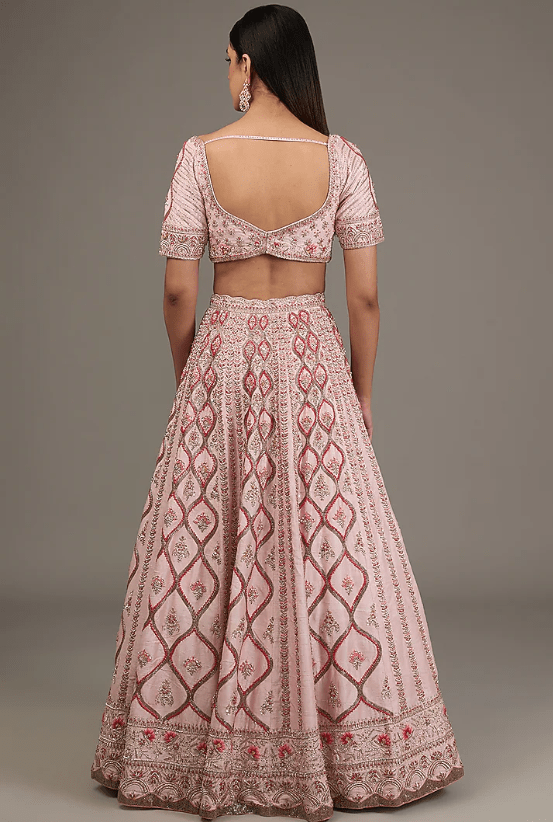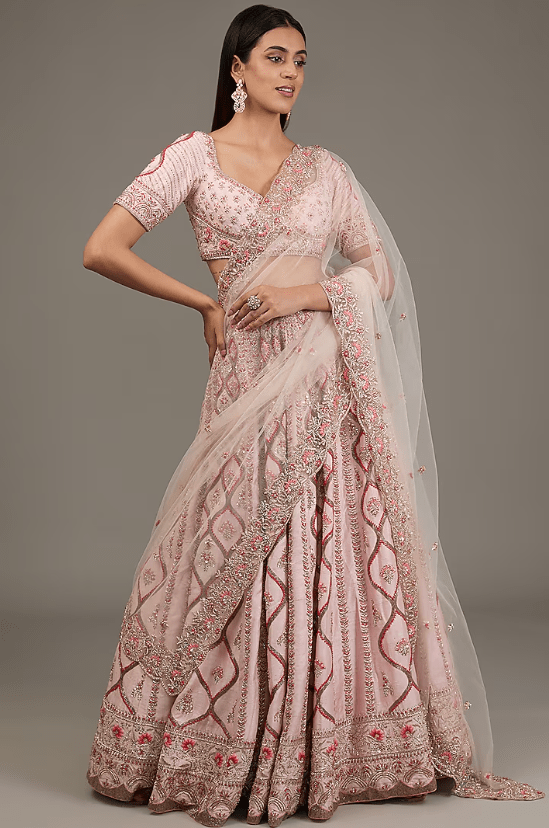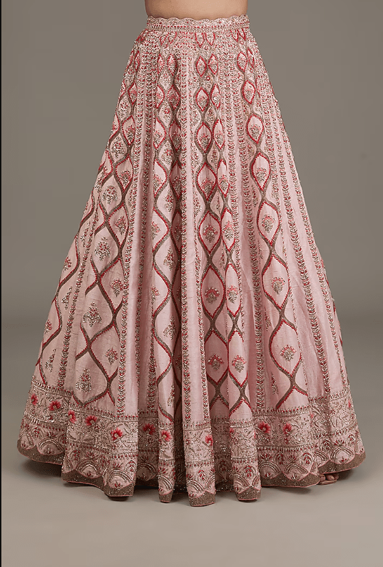 Featuring a powder pink lehenga in raw silk base with hand embellishments. it is paired with a blouse and a net dupatta. For weddings, a bride can style her bridal lehenga with statement jewelry and elegant heels to create a breathtaking, traditional look.