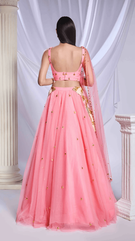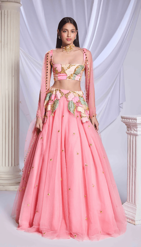 Our pink tulle lehenga is adorned with intricate patchwork embroidery and metallic accents cascading from the waist to the hips. The lehenga is embellished with scatter embroidery, featuring gold elements and delicate pink crystals throughout. Completing the ensemble is a sleeveless pink blouse featuring matching patchwork.