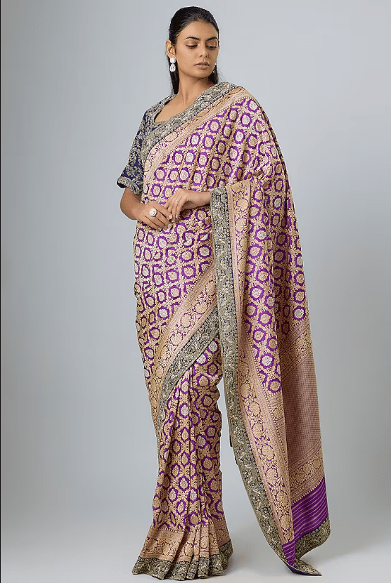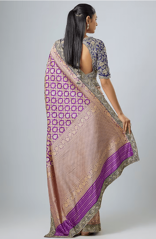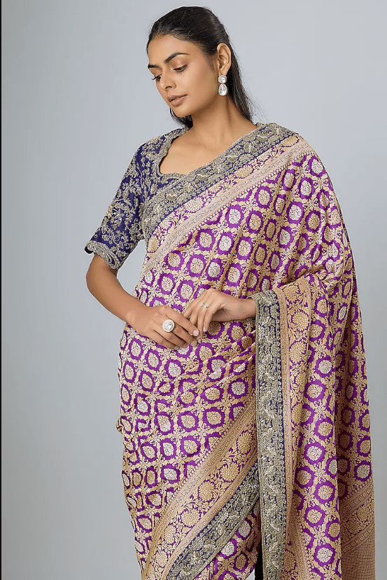 Featuring a purple saree in banarasi base with zardosi embroidery. It is paired with a blouse. Accentuate with statement earrings and heels for festive occasions or wedding ceremonies.