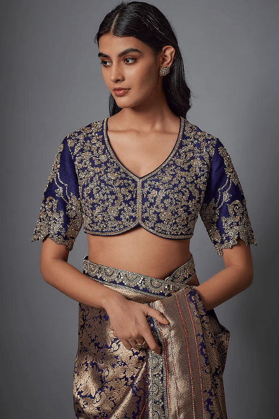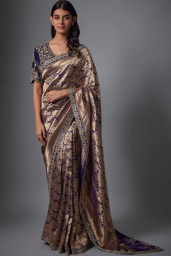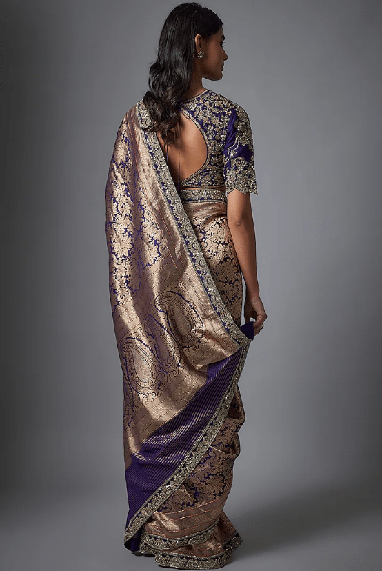 Featuring a purple saree in banarasi base with zardosi embroidery. It is paired with a blouse. Accentuate with statement jewellery and heels for a festive occasion, wedding or sangeet ceremony.
