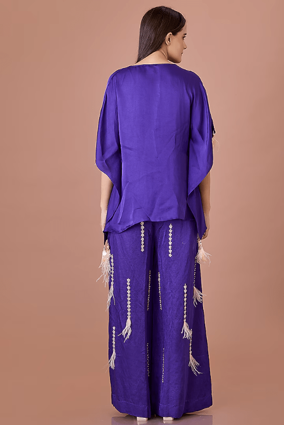 Featuring a purple draped kaftan in blended satin base with a low-neckline and latkans detail. Accentuate with dangler earrings and heels for a festive look.