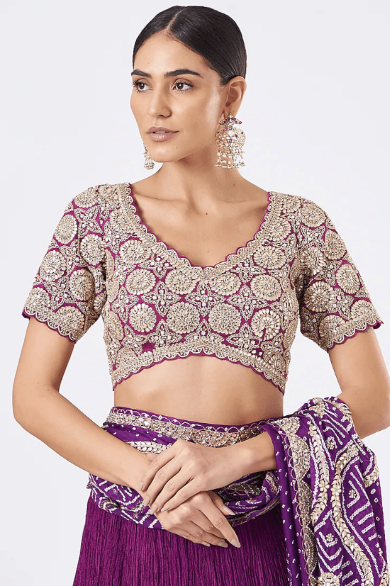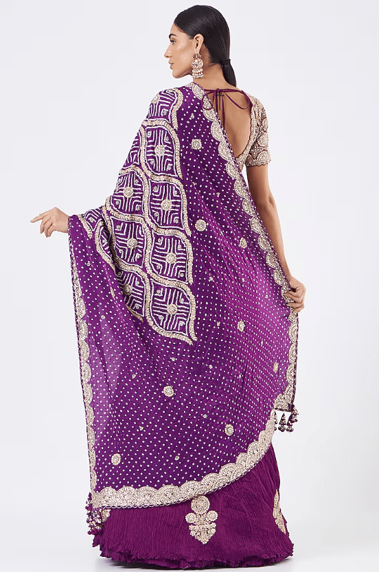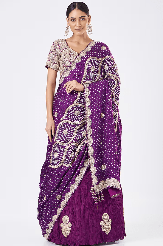 Featuring a purple lehenga saree in crushed silk base with an attached bandhani dupatta. It is paired with a matching blouse.