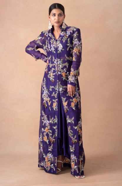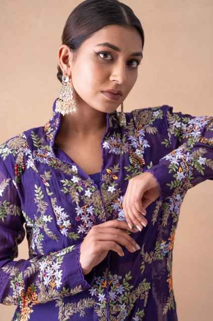 No Of Components : 3 (Jacket + Bustier + Skirt)Colour : PurpleMaterial/Fabric : Silk