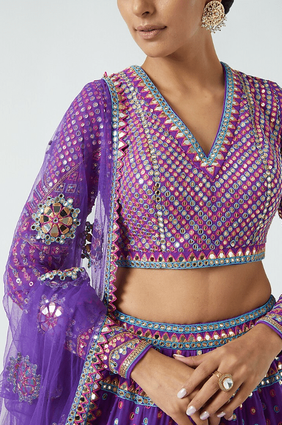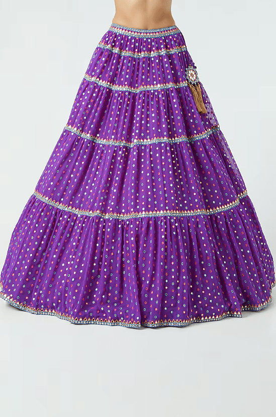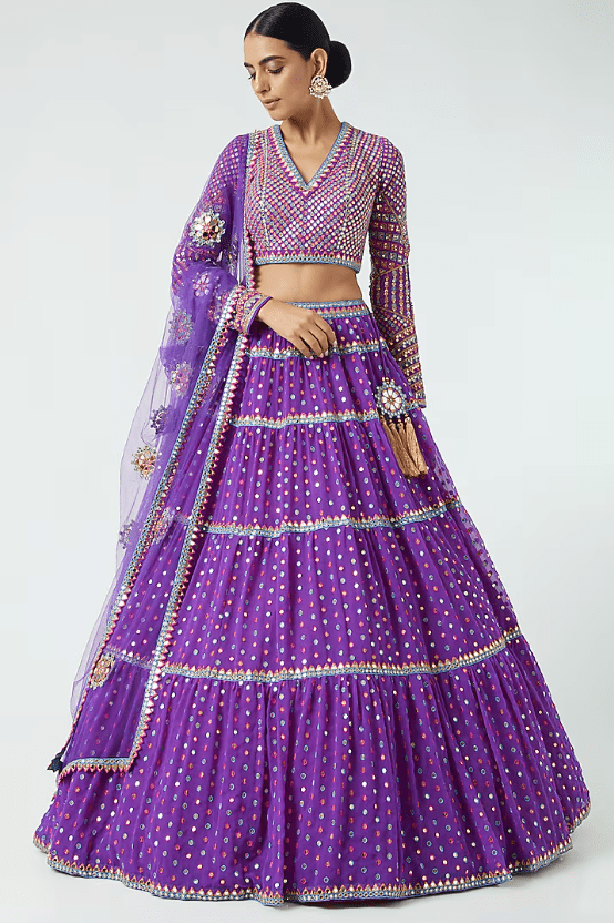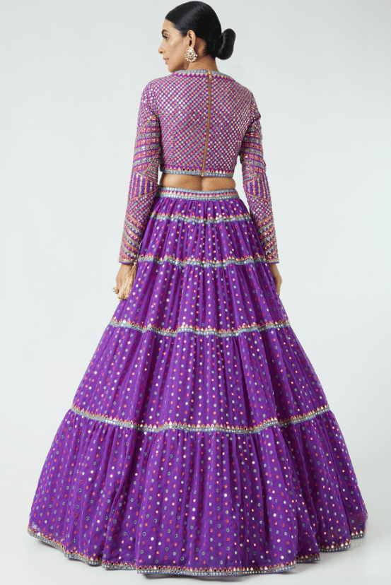 Featuring a purple tiered lehenga in georgette base with sequins and hand-cut mirror border. It is paired with a matching blouse and a net dupatta.Accentuate this statement lehenga with a pair of heels and statement jewellery for your wedding/sangeet/engagement/trousseau look.