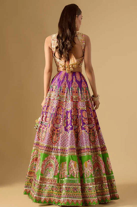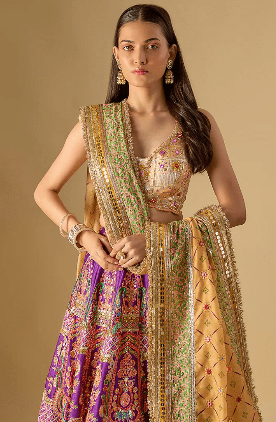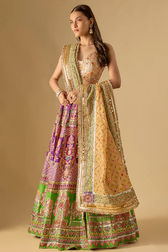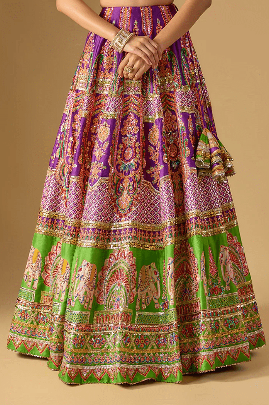 Featuring an exquisite Purple And Green Lehenga crafted in a silk base, adorned with resham, mirror, sequins and gota embroidery. It is paired with a finely embroidered blouse and a chanderi embroidered dupatta. Elevate this designer ensemble with kundan polki jewellery, a floral hairdo, and embellished block heels for a striking bridal look, perfect for weddings, engagements, or sangeet ceremonies.