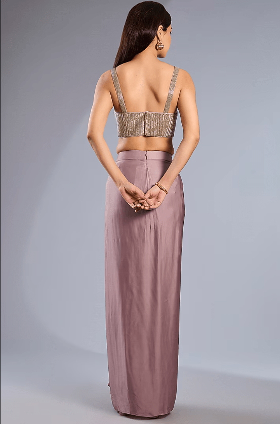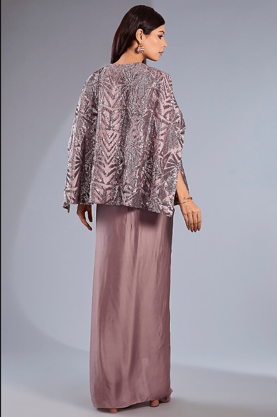 Featuring a purple jacket in net base with slit sleeves and sequins embroidery. It is paired with a silk hand-embroidered bustier and a silk satin draped skirt. Accentuate it with statement jewellery and heels for a cocktail or sangeet ceremony.