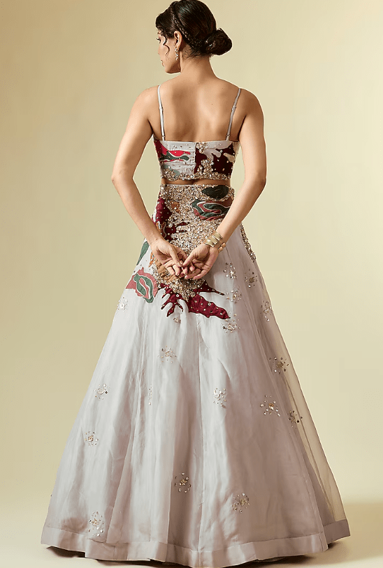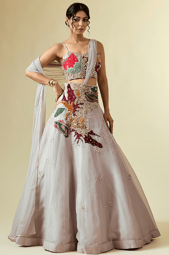Featuring a purple lehenga in chanderi and organza base with laser cut appliqu? embroidery. It is paired with an embroidered blouse, a dupatta and a cancan. Accentuate with statement jewellery and heels for a bridal look. Perfect wear for a wedding or engagement ceremony.