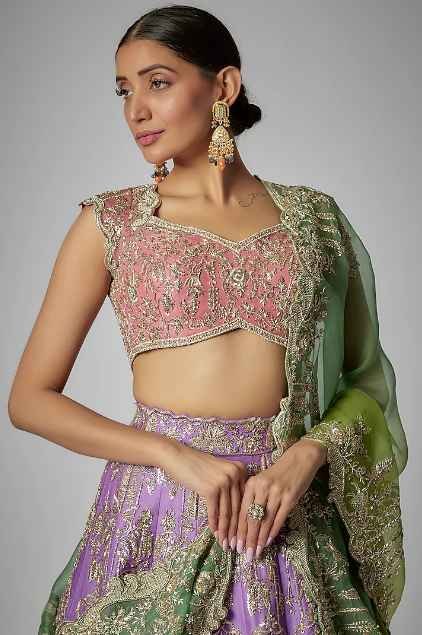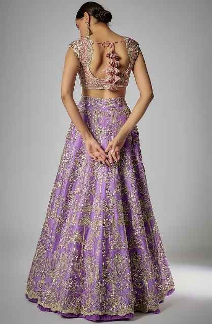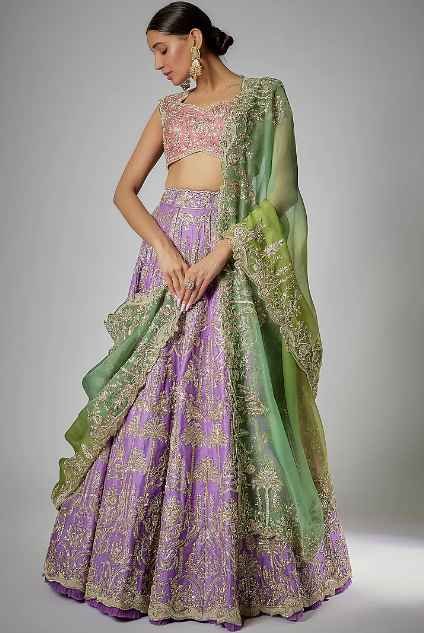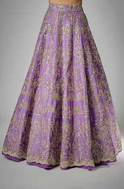Featuring a gracious purple lehenga in organza base, an ideal and aesthetically designed choice for the contemporary Indian bride. This chic lehenga set has the ageless craftsmanship of zardosi work. It includes a matching blouse and a contrasting dupatta to complete the royal bride’s look.