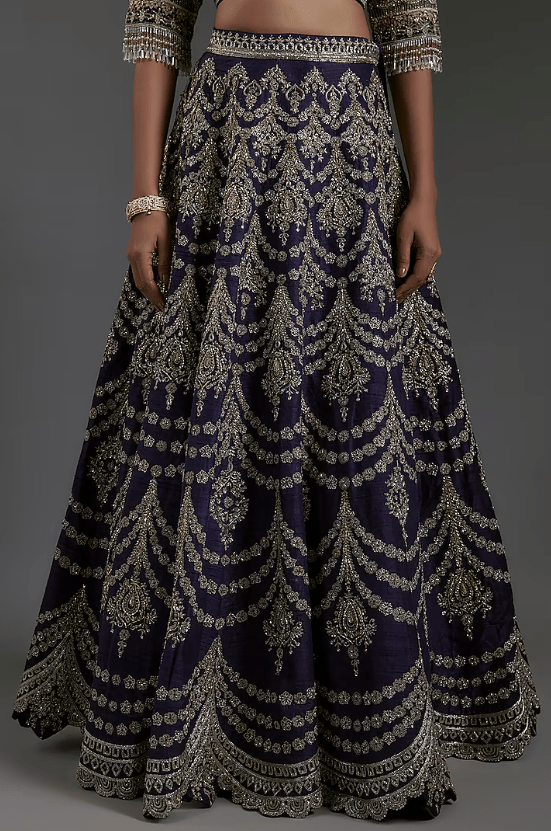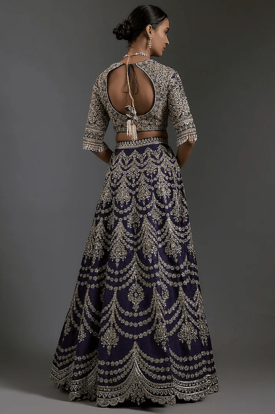 Featuring a purple lehenga in raw silk base with zardosi embroidery. It is paired with a blouse and a dupatta. Accentuate with statement jewellery and heels for a wedding, sangeet or engagement ceremony.