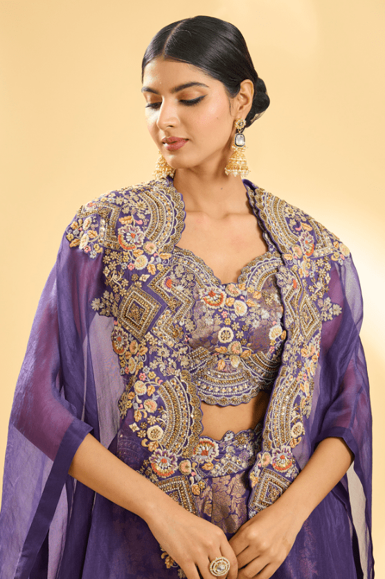 Featuring a purple jacket in shimmer brocade, organza and chanderi base with hand and machine embroidery. It is paired with an embroidered bustier and a skirt. Accentuate it with statement jewellery and heels for a wedding or sangeet ceremony.