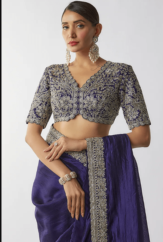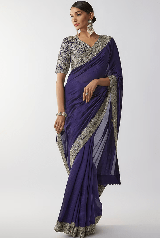 Featuring a purple saree in silk base with zari embroidery. It is paired with an embroidered blouse. Accentuate it with statement earrings and heels for weddings or sangeet ceremonies.
