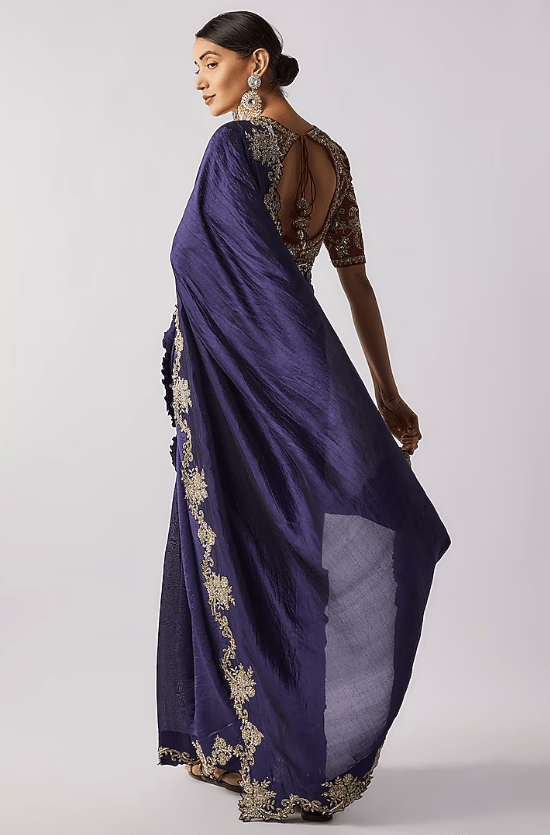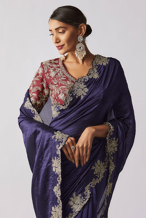 Featuring a purple saree in silk base with zari embroidery. It is paired with a red embroidered blouse. Accentuate it with statement earrings and heels for weddings or sangeet ceremonies.