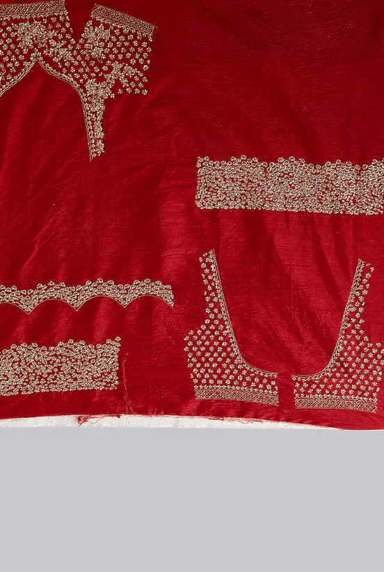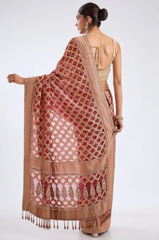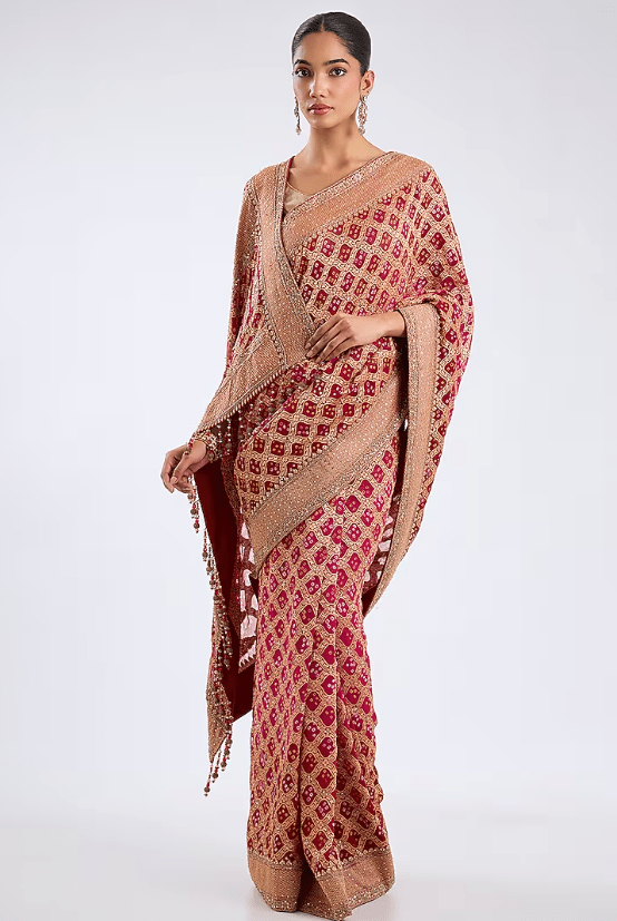Featuring a red saree in bandhej base with embroidery. It is paired with an unstitched blouse. Elevate this designer ensemble with kundan polki jewellery, a floral hairdo, and embellished block heels for festive occasions or weddings ceremonies.