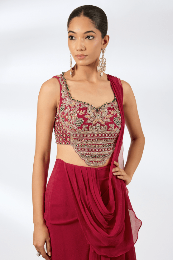 Featuring a red draped saree in chiffon base. It is paired with a net embroidered blouse having back tie-up. Accentuate it with statement jewellery and heels for festive occasions or wedding ceremony.