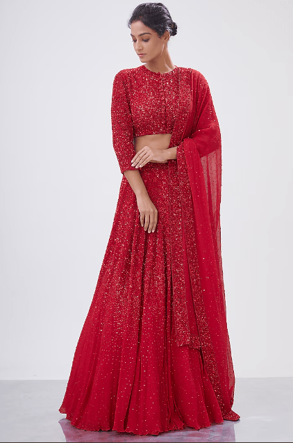 Featuring a red lehenga in chiffon base with sequins embroidery. It is paired with a matching blouse and dupatta.
