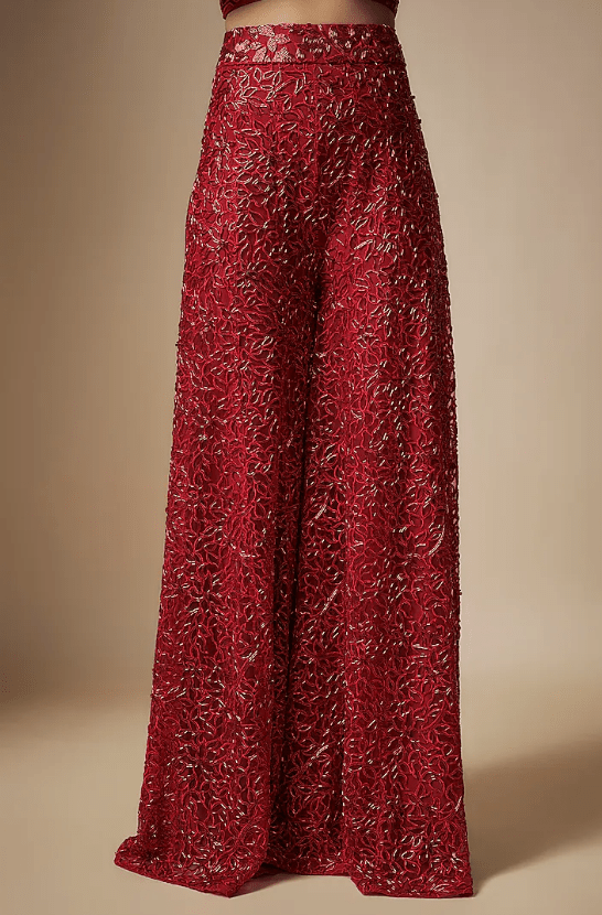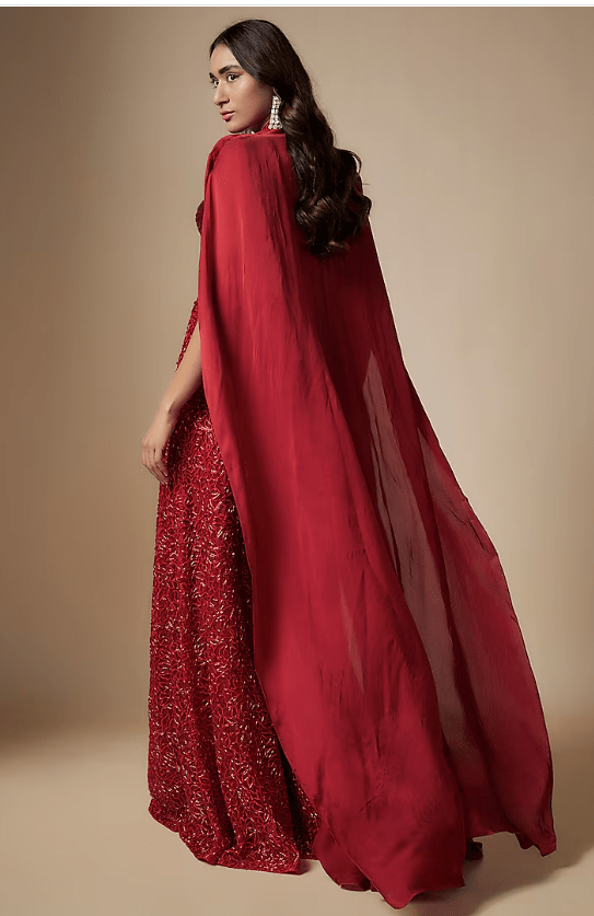 Featuring a red cape in organza base. It is paired with a muslin and chanderi hand embroidered corset and embroidered sharara pants. Accentuate it with statement jewellery and heels for a festive occasion, wedding or engagement ceremony.