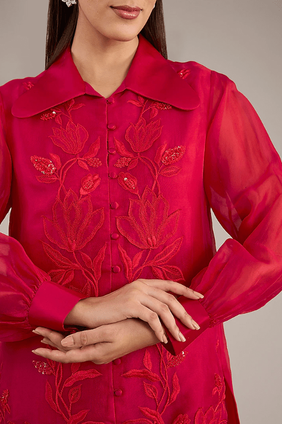 Featuring a red shirt in organza base with embroidery. Accentuate it with pants, statement earrings and heels for a complete look.