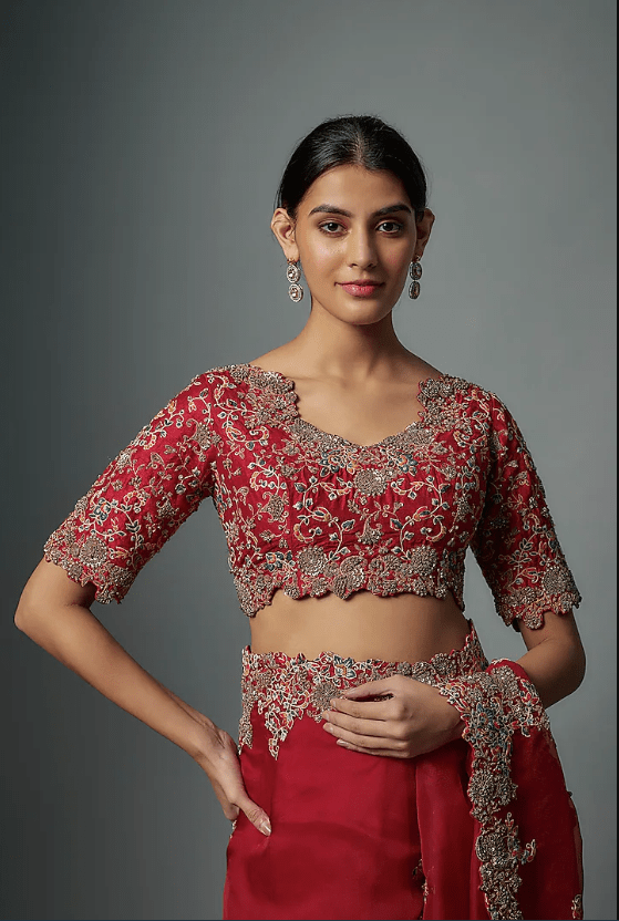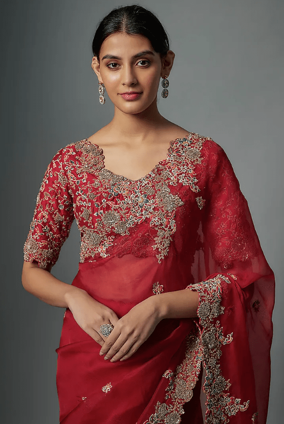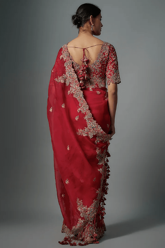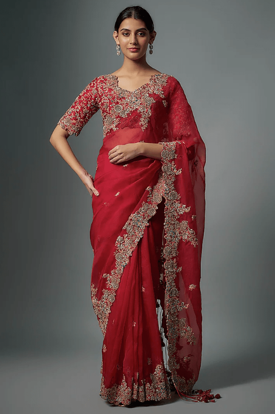 Featuring a red saree in organza base with resham work. It is paired with a silk embroidered blouse. Accentuate with statement jewellery and heels for a wedding, sangeet or engagement ceremony.