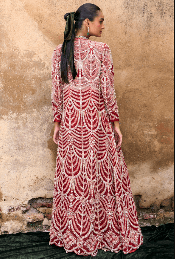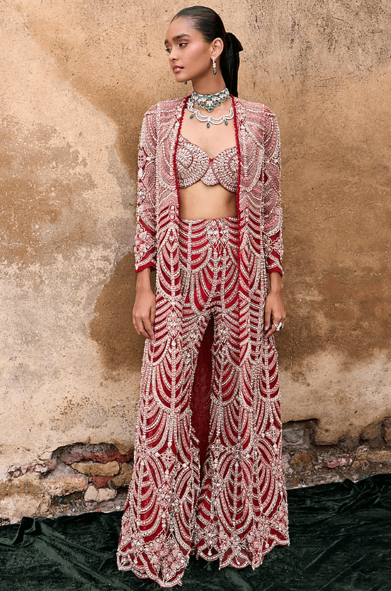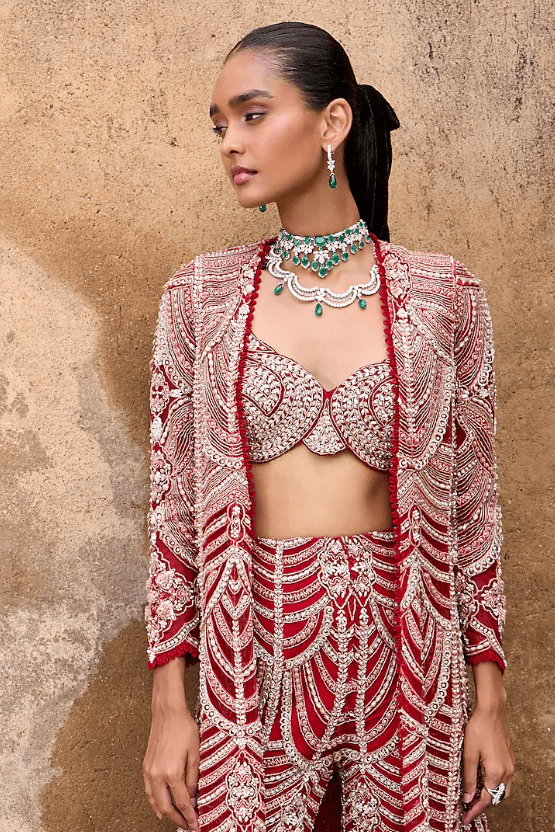 Red Jacket Set that captivates with its elegance. The eye-catching jacket is crafted in organza and net with scalloped embroidery. It is paired with an embroidered bustier and pants. Accessorize the designer set with statement earrings and heels for an evening soiree, sangeet or cocktail ceremony.