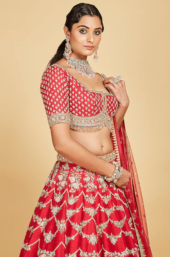Featuring a red lehenga in raw silk base with pearl, resham, cutdana, and sequins hand embroidery. It is paired with a matching embroidered blouse, a net dupatta, and a veil. Perfect wear for a bridal look.