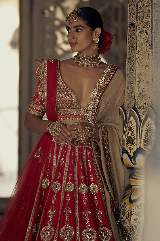 red lehenga in raw silk base with dori, dabka, bead, crystal and sequins embroidery. It is paired with a blouse and a net dupatta. Accentuate it with statement jewellery and heels for a wedding or engagement ceremony.