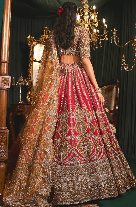 Red Lehenga Set that captivates with its elegance. The eye-catching lehenga is crafted in raw silk with moti, sequins and zari embroidery. It is paired with an embroidered blouse having tassels detail and a burnt mustard net dupatta. Accentuate it with statement jewelry and heels for a regal look, ideal for a wedding or engagement ceremony.