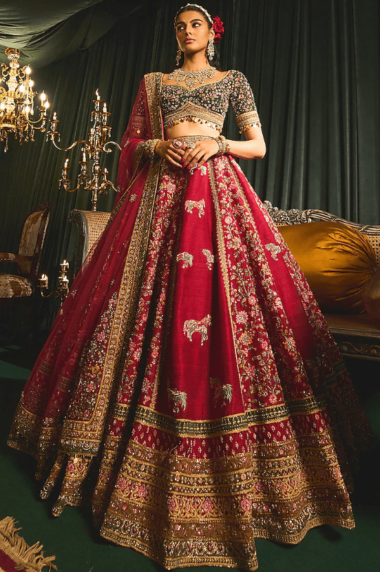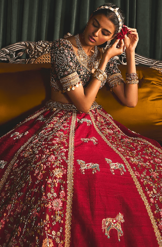 Red Raw Silk Zari & Sequins Embroidered Lehenga Set