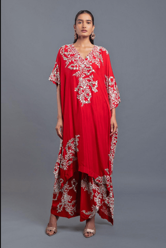 Red Satin Silk Embroidered Long Kurta & Skirt Set