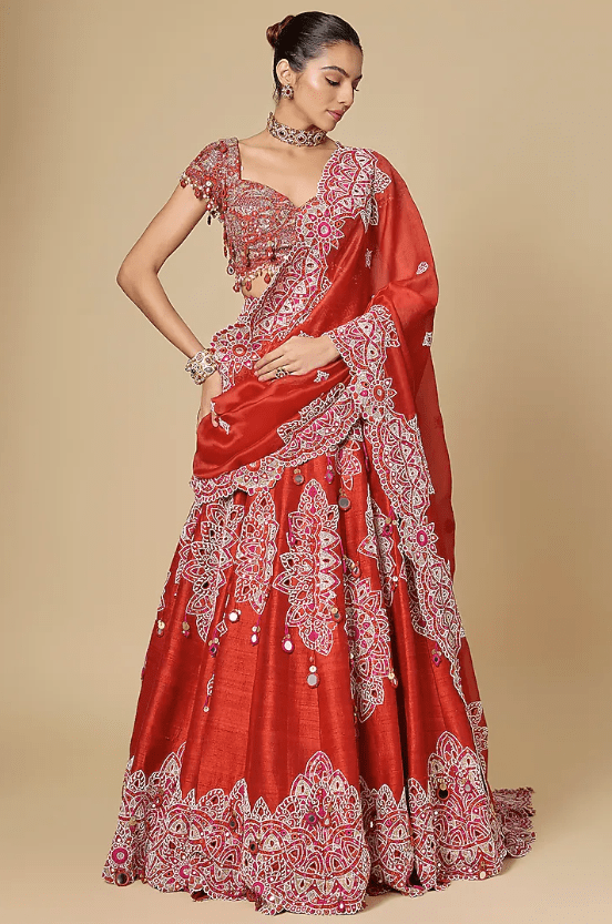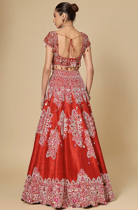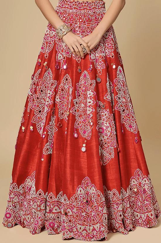 Featuring a red lehenga in silk base with mirror work. It is paired with an embroidered blouse and an organza mirror work dupatta. Accentuate it with zircon jewellery and heels for a wedding or engagement ceremony.
