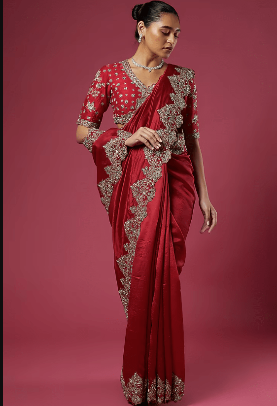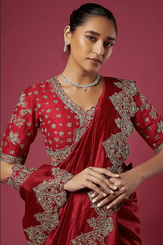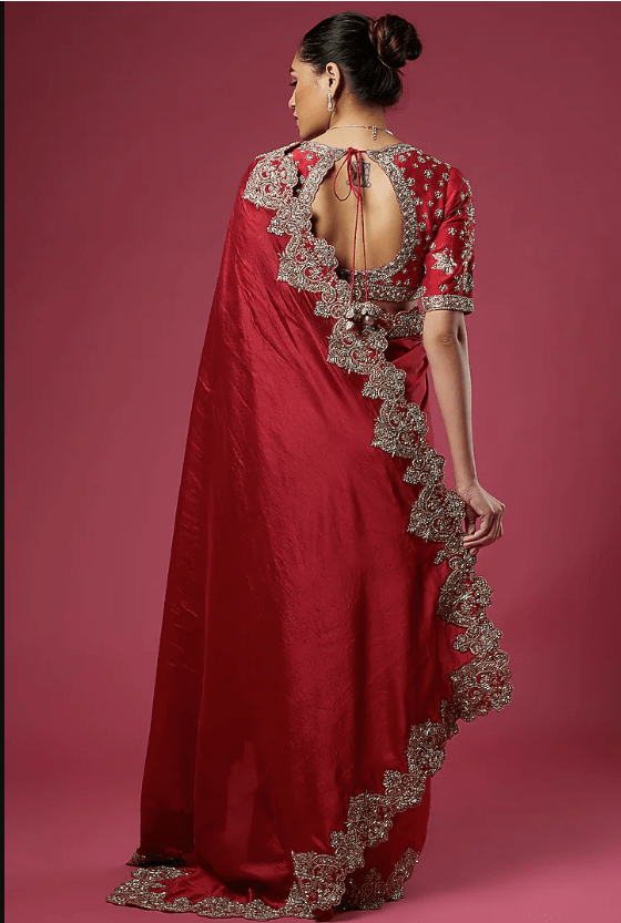 Introducing our beautiful Saree Set, perfect for any special occasion. This stunning saree features a stunning red in silk base with intricate zardosi embroidery. It is paired with an embroidered blouse having a V-neckline. Our Saree Set is crafted with the finest materials and is sure to make you stand out in any crowd. Make a statement and look beautiful in our Saree Set.