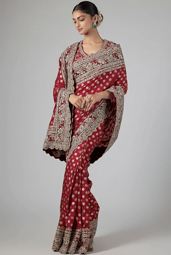 Featuring a red saree in silk base with zardosi embroidery. It is paired with an embroidered blouse. Accentuate it with statement jewellery, a low bun and heels for a wedding, sangeet or engagement ceremony.