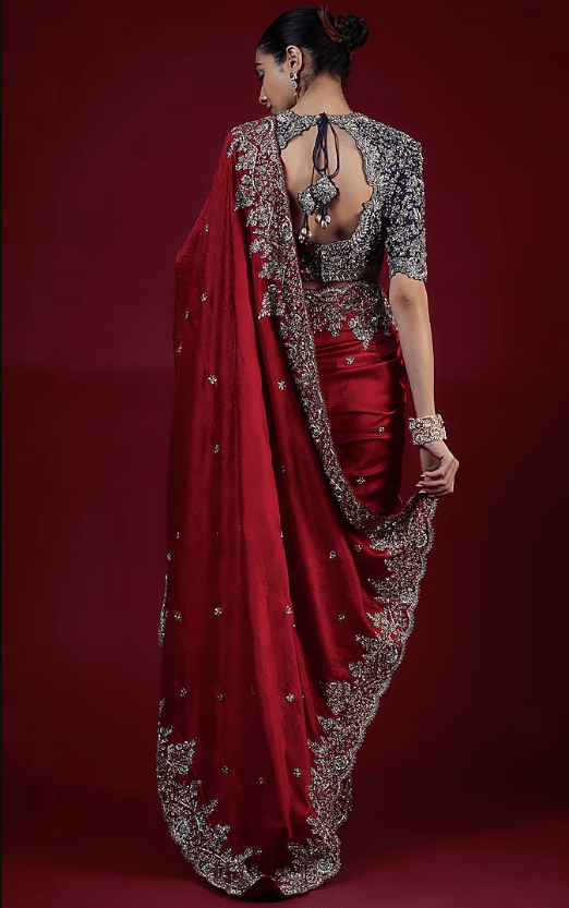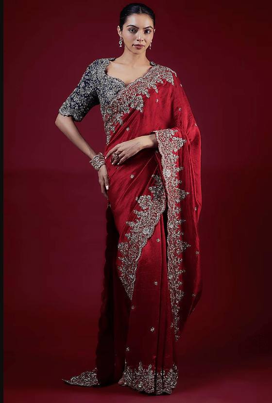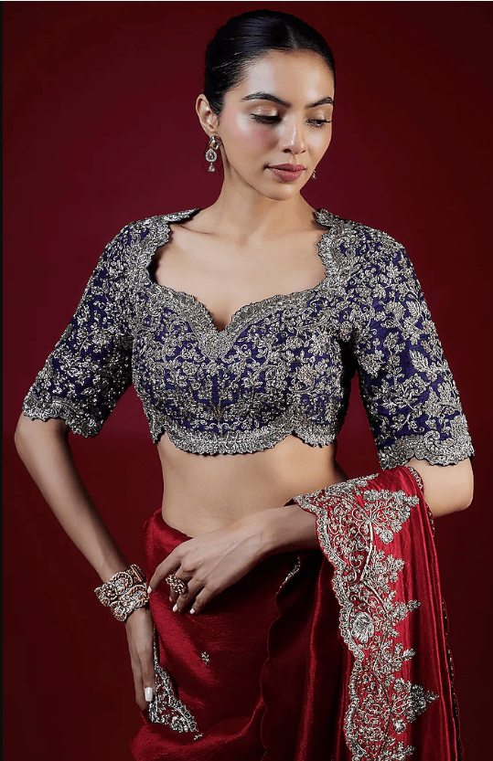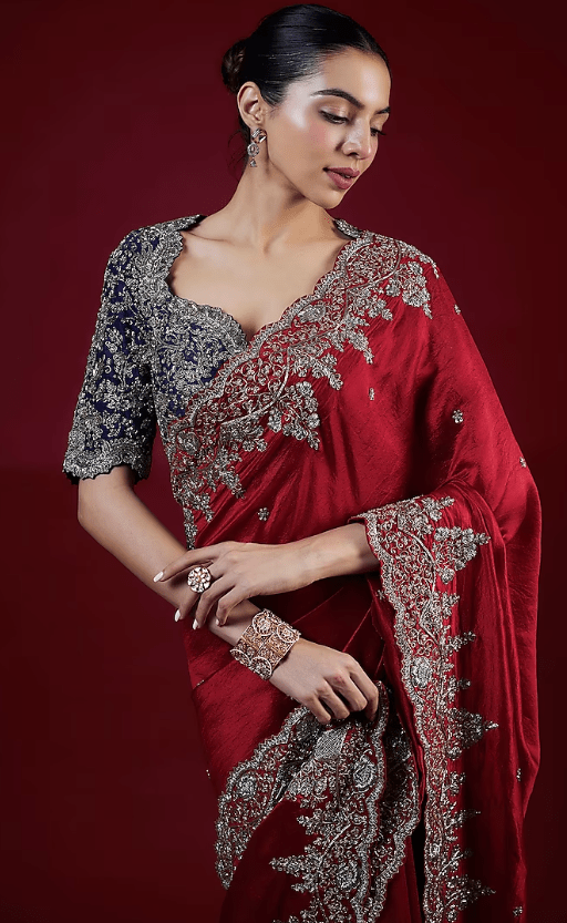 Featuring a red saree in silk base with zari embroidery. It is paired with a purple embroidered blouse. Accentuate with dangler earrings and heels for a wedding or engagement ceremony.