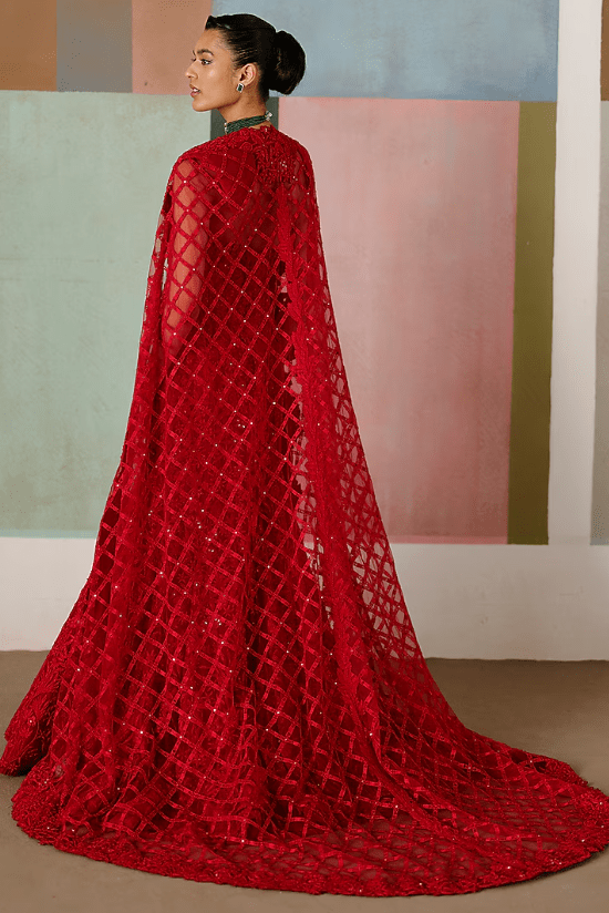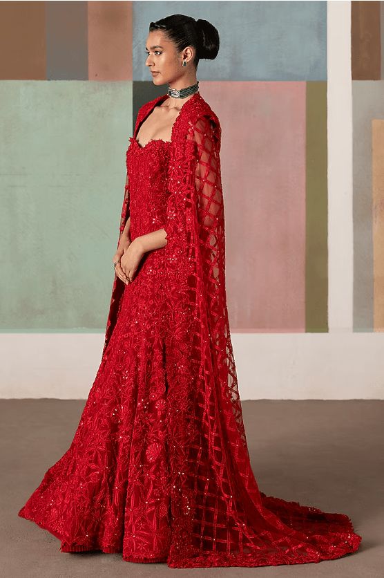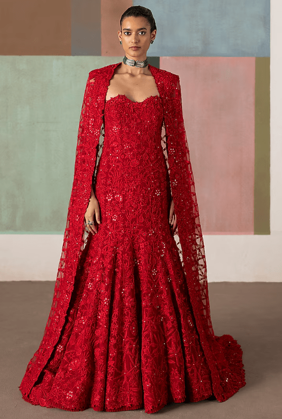 Featuring a red cape in tulle base with embroidery. It is paired with an organza strapless gown. Accentuate it with statement earrings and heels for an evening look.