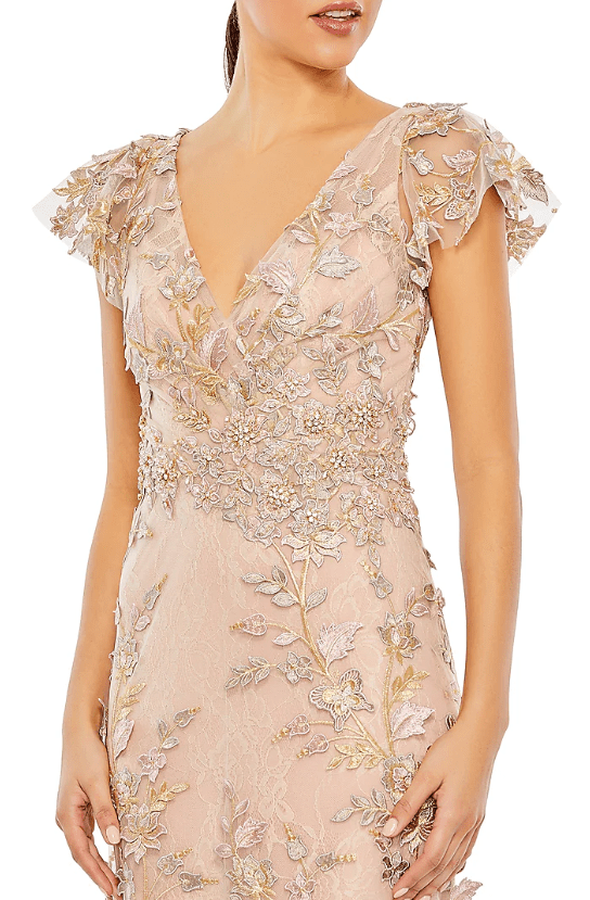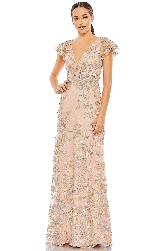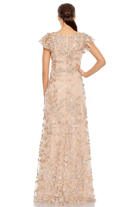 Featuring a rose gold gown in embroidered fabric base with flutter sleeves and floral embellishments. Accentuate it with dangler earrings and heels for evening soirees or cocktail parties.