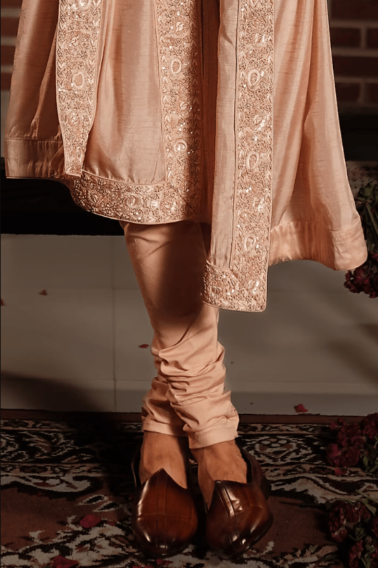Featuring a rose gold ombre achkan sherwani in silk base with resham embroidery. It is paired with a kali kurta, stretch cotton churidar pants and an embroidered dupatta. Perfect for wedding ceremonies.