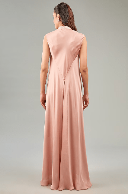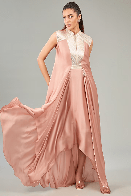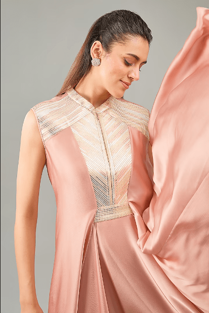 Featuring a rose pink dress in metallic polymer and crepe chiffon base. It is paired with a slip and a belt. Accentuate it with statement earrings and heels for evening wear or cocktail party.