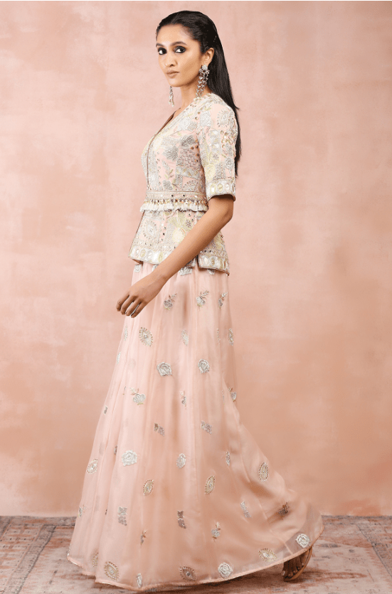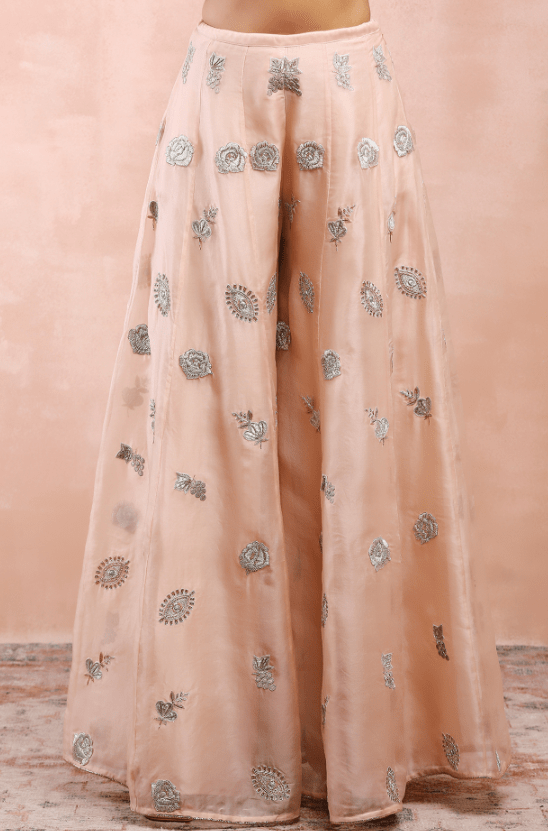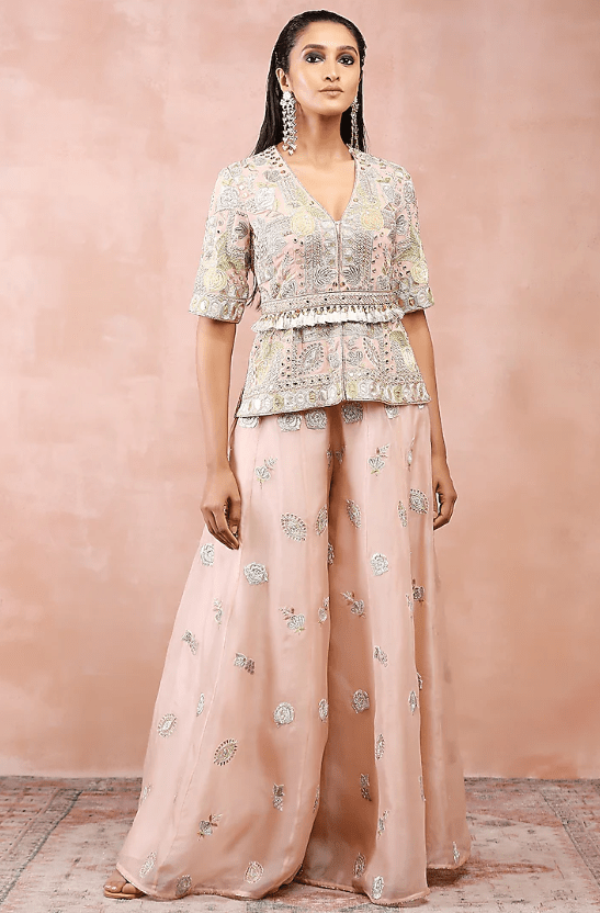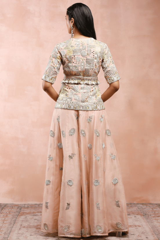Rose Pink Sharara Set. Adorned with exquisite applique embroidery, the designer sharara set will be a perfect fit for weddings and festive occasions. The rose pink short kurta is crafted in georgette. It comes with matching organza sharara pants and a belt.