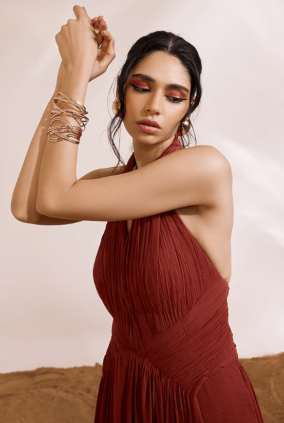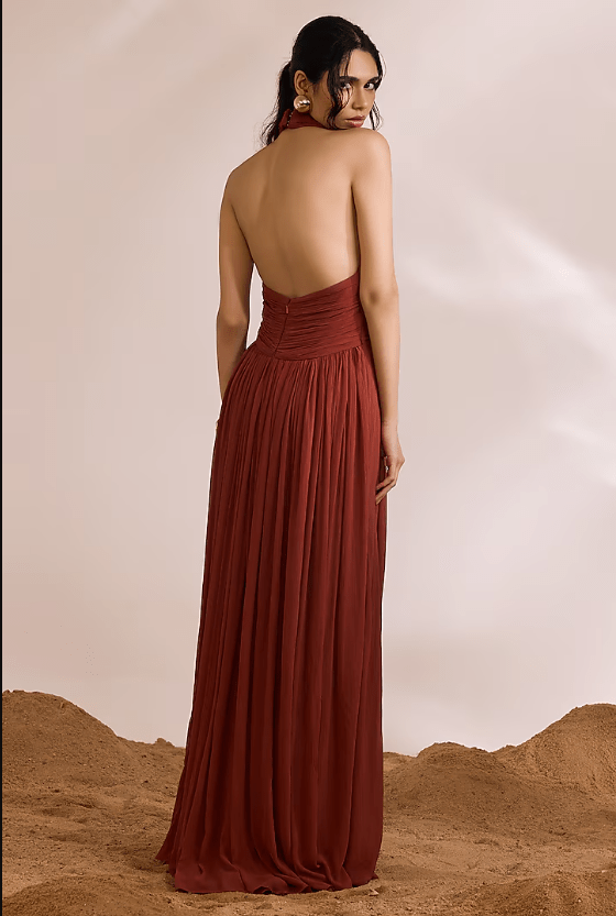 Featuring a rust fluted drape dress in crinkle chiffon base with pleats and gather details, including a v-neck. Accentuate it with statement jewellery and heels for evening wear.