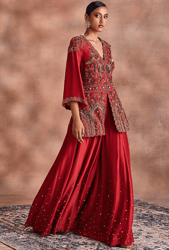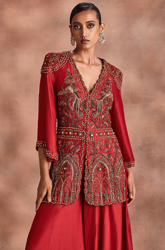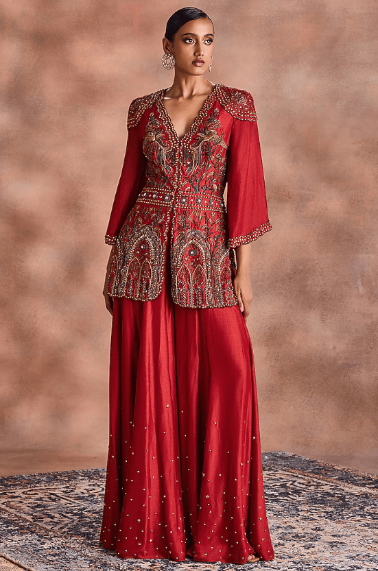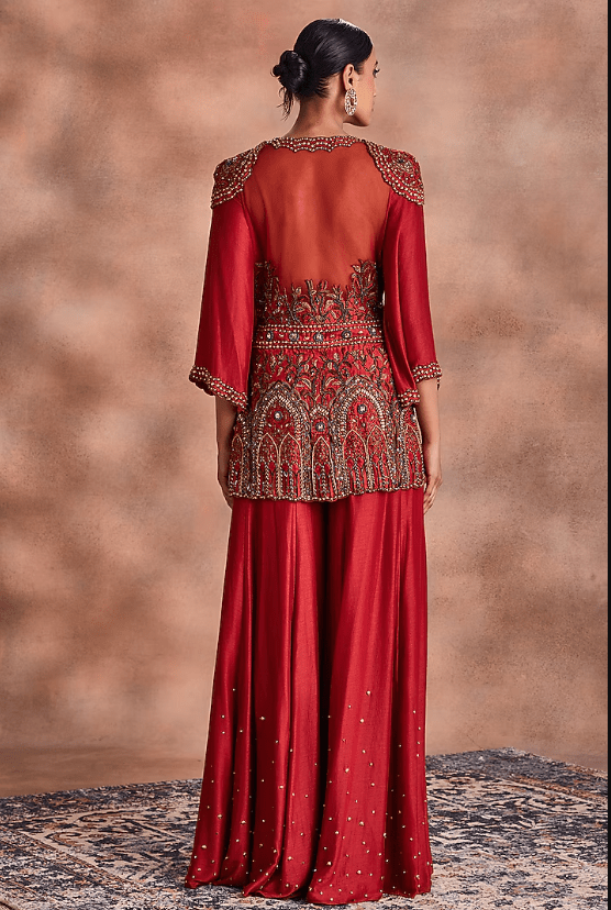 Featuring a rust top in mori silk base with embroidery. It is paired with pants. Accentuate with statement jewellery and heels for festive occasions or wedding ceremonies.