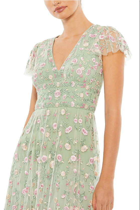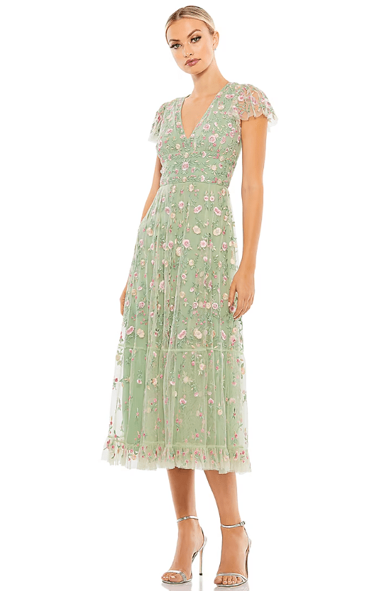 Featuring a sage green midi dress in mesh base with cap sleeves, a V-neckline and embroidery. Accentuate it with dangler earrings and heels for evening soirees or cocktail parties.