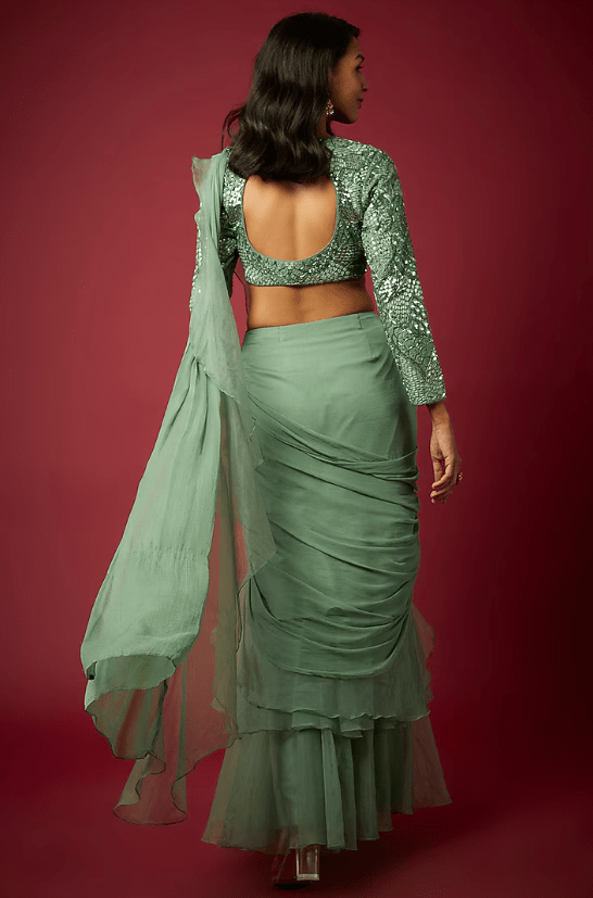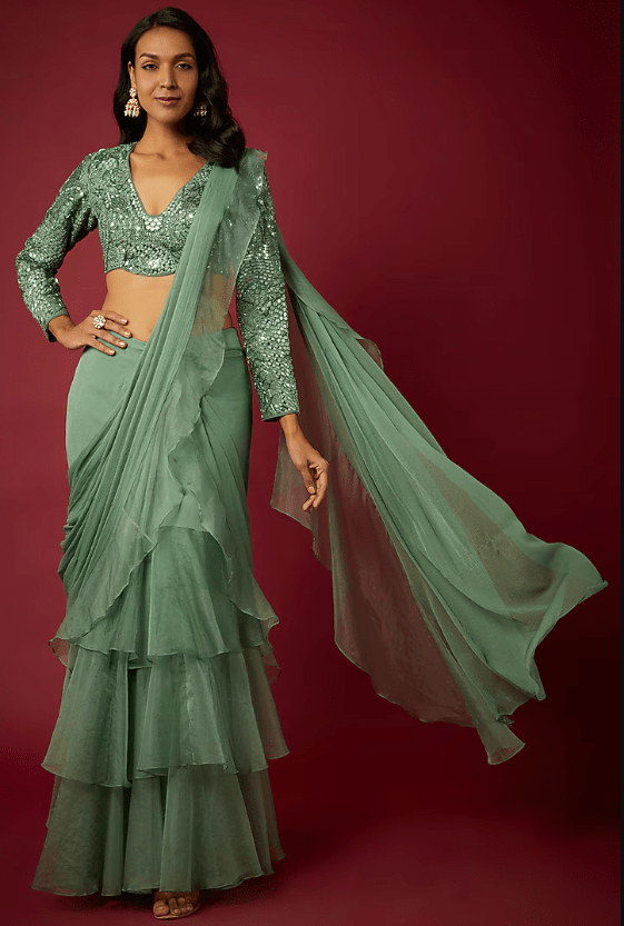 Sage Green Organza & Chiffon Ruffled Saree Set
