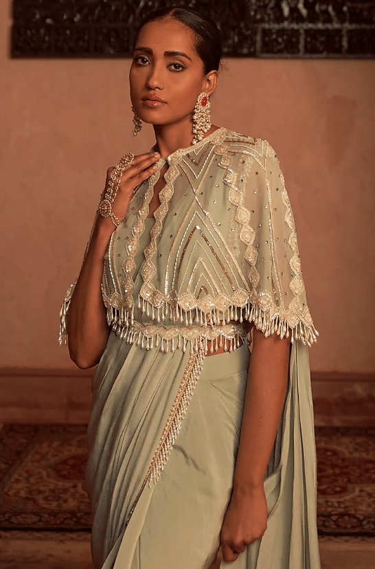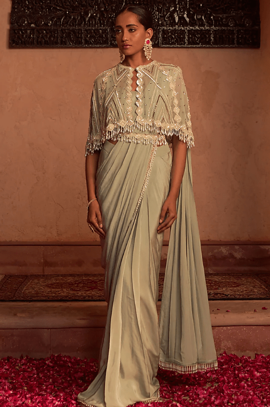 Featuring a sap green draped saree in crepe base. It is paired with a georgette cape having beaded and sequins embroidery, including a belt and a blouse. Accentuate with statement jewellery and heels for a cocktail ceremony.