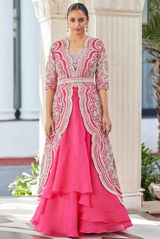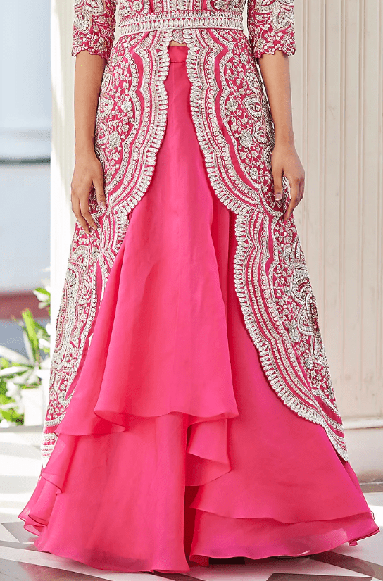 Featuring a scarlet jacket in organza base with embroidery. Accentuate it with a lehenga, top, statement jewellery and heels for sangeet ceremonies.