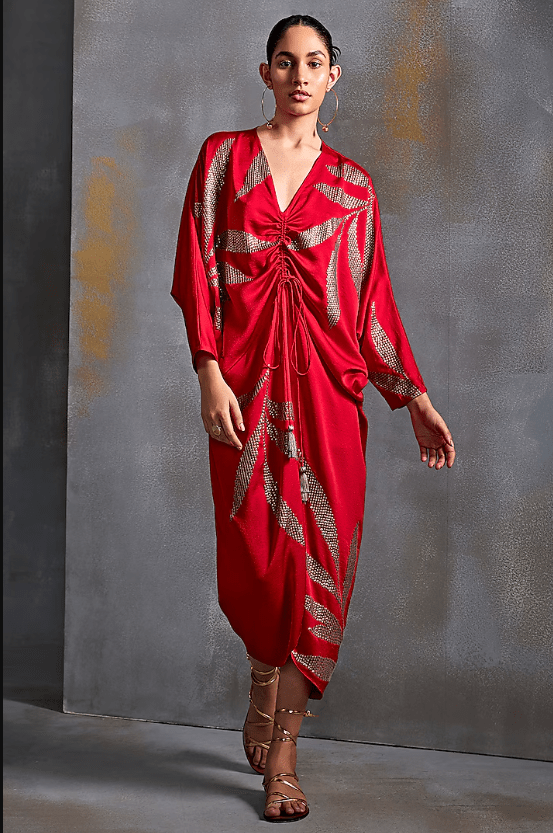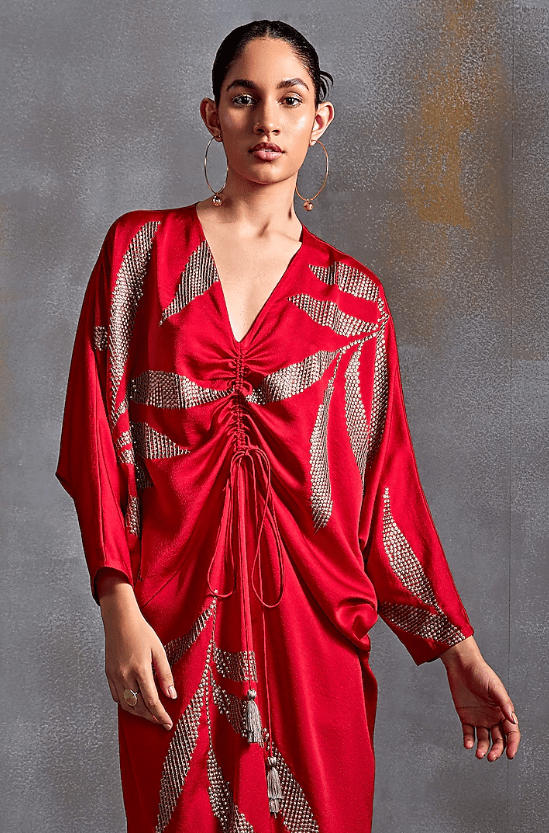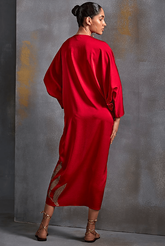 Scarlet Draped Dress that captivates with its elegance. The eye-catching dress is crafted in satin with floral hand embellishments. Style it with dangler earrings and heels for a complete look.