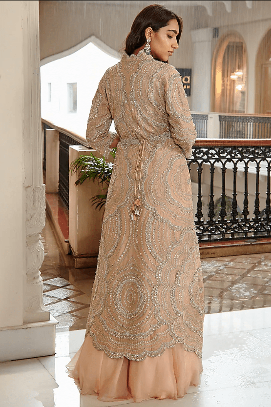 Featuring a sepia rose jacket in tissue base with zardosi hand embroidery and french knot. It is paired a with matching organza skirt and an embroidered bustier.