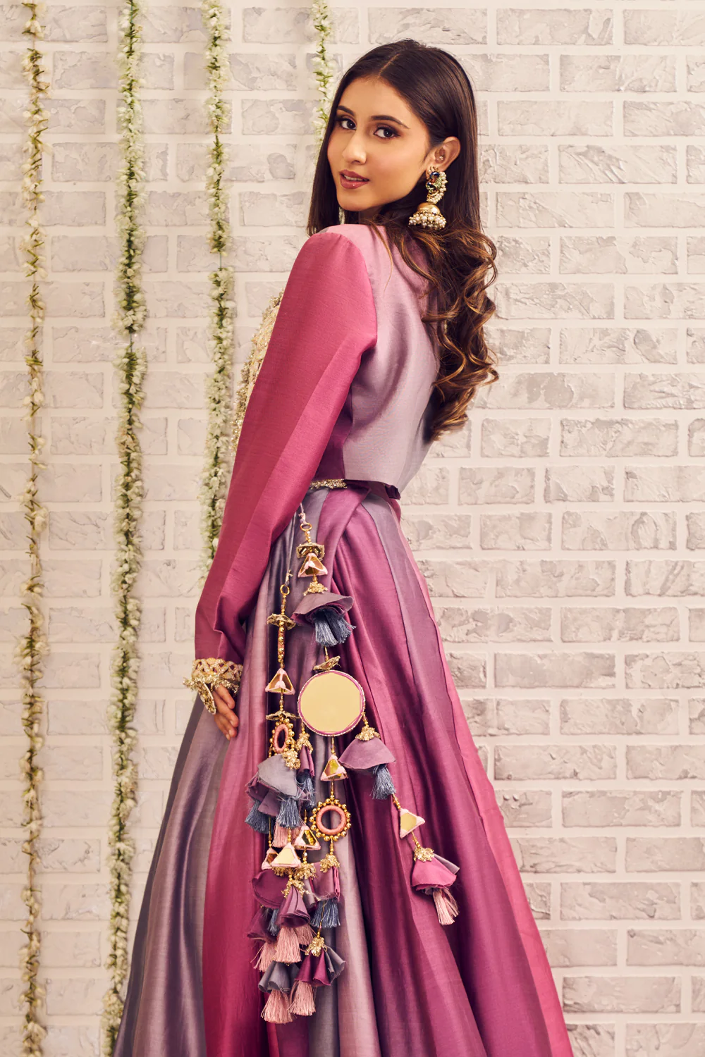 Kalidar skirt with full sleeved jacket and strap bustier. Heavy latkans. Handwork patch on jacket. Laces on hems.