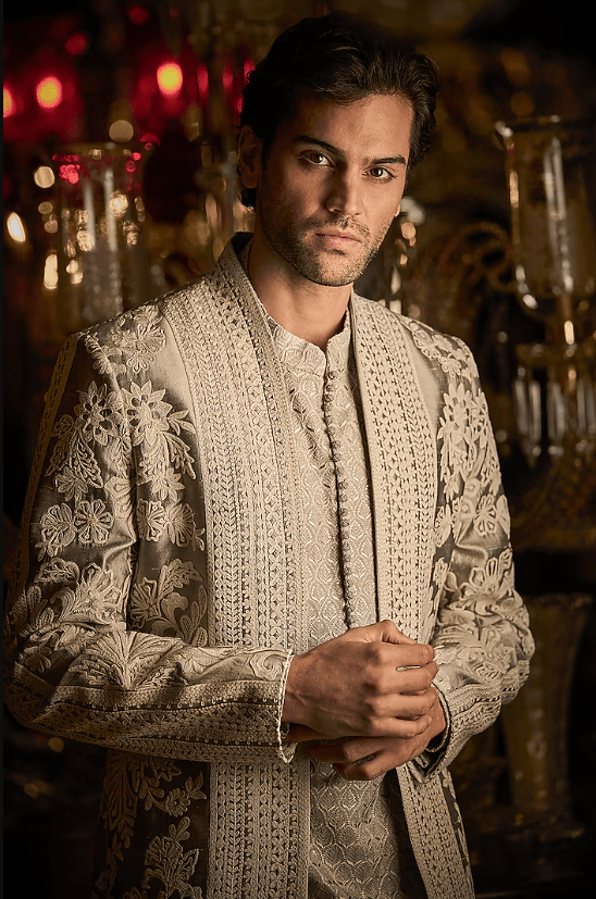 Silver Grey Silk Embroidered Indowestern Set With Juttis